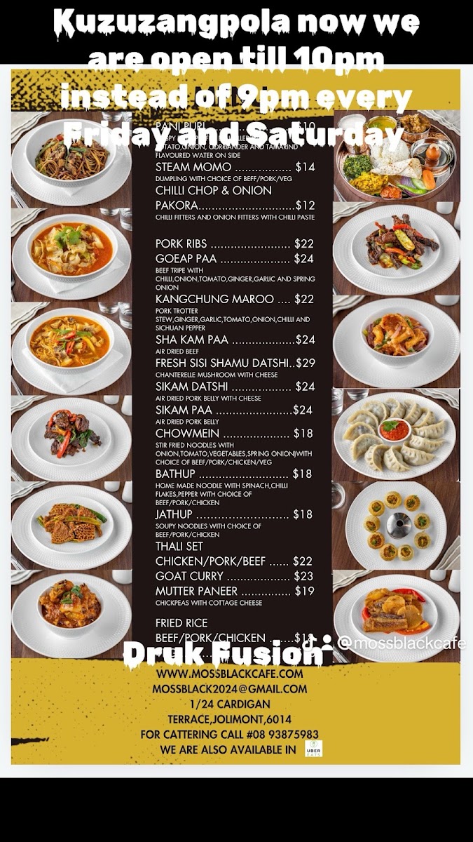 Welcome to Moss Black Cafe/Druk Fusion, a hidden gem nestled in the heart of Jolimont, WA. This cozy cafe offers a unique blend of authentic Bhutanese cuisine that captivates both the palate and the spirit. The menu features an impressive array of dishes, highlighting the rich flavors of Bhutan, such as the mouthwatering Thali Set and the delightful Steamed Momo Dumpling available with your choice of beef, pork, or vegetables.